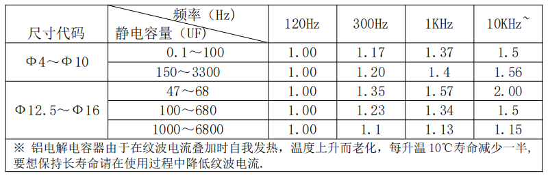 23. 额定纹波电流的频率导数 :Frequency Coefficient of Allowable Ripple Current
