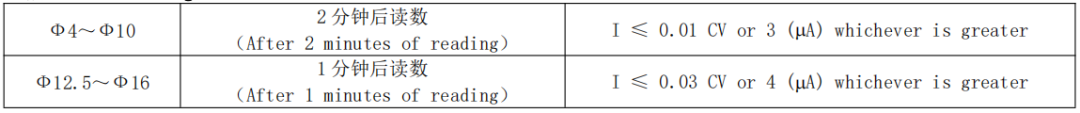 贮存超过 2 年的电容器,其漏电流可能增大。若漏电流增大,请使用 1KΩ电阻做充电处理.
