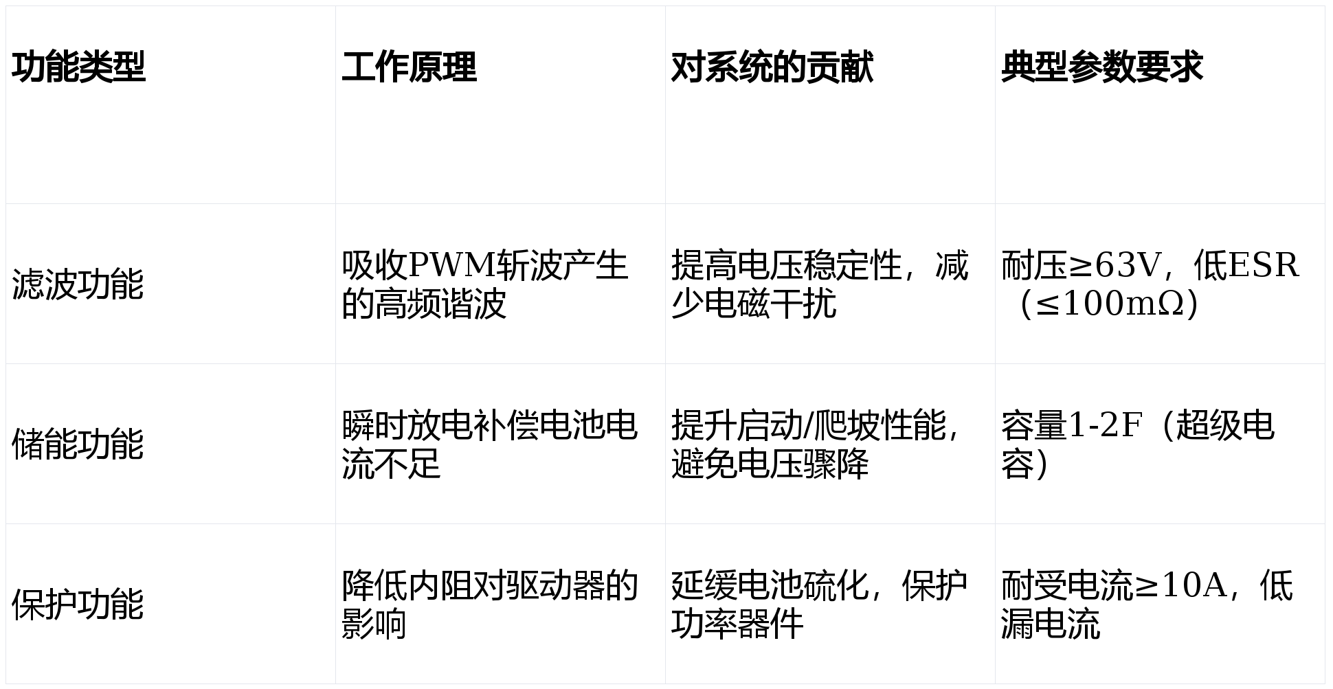 表:电解电容在48V电动车系统中的功能对比